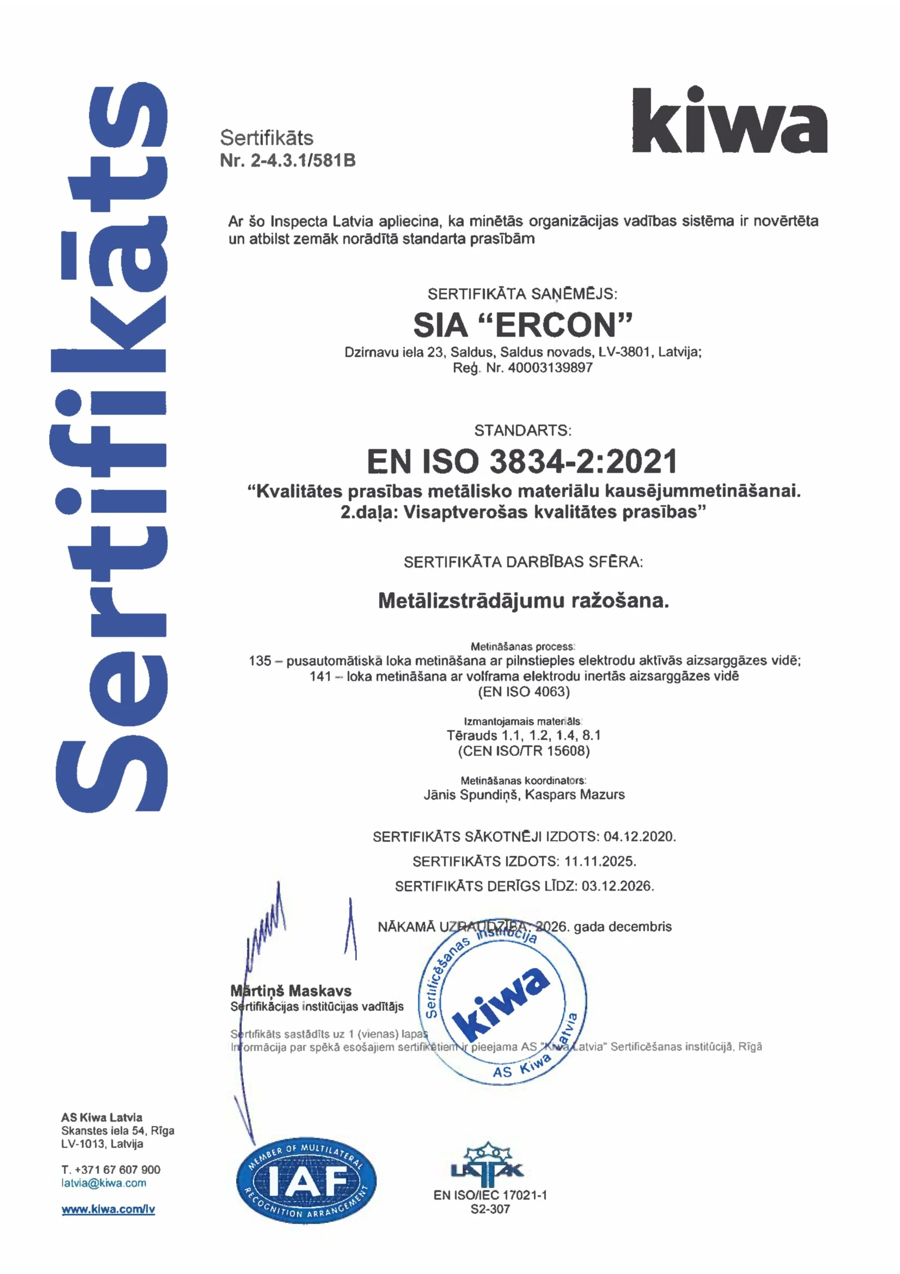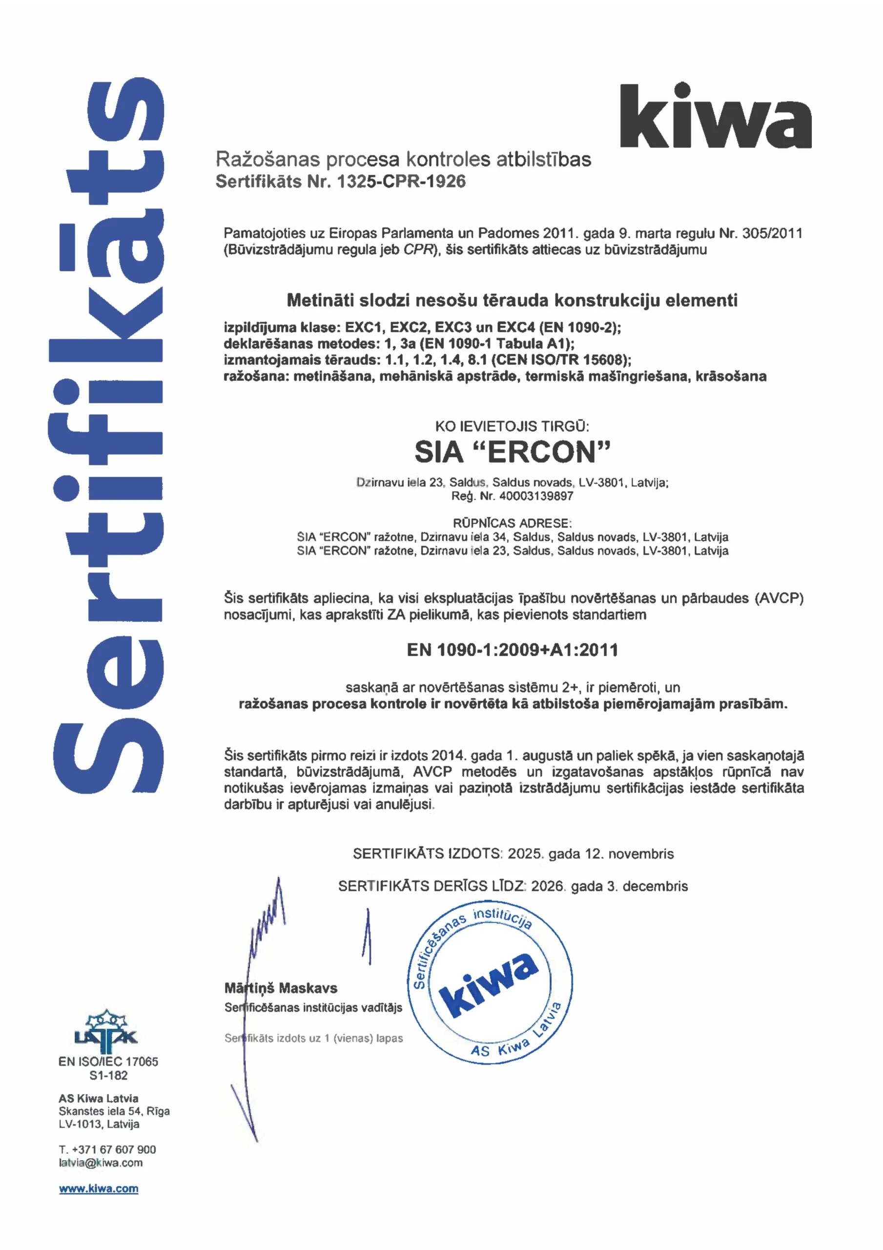 ERCON ir ieguvis INSPECTA ražošanas procesa kontroles sertifikātu Nr. 1325-CPD-1926 atbilstoši standarta LVS EN 1090-1:2009 un 1090-1:2009/AC:2010 prasībām, kas ražotājam piešķir tiesības marķēt sertificēto produktu ar CE zīmi.